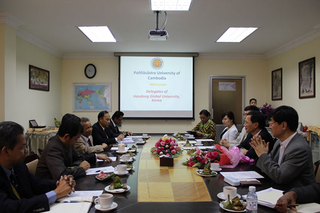 Delegate from Handong Global University (HGU) visited Paññāsātra University of Cambodia in their second time since their last visit in 2010. It is remarked that in the last two years the University of Handong Global has signed Memorandum of Understanding (MOU) with Paññāsātra University of Cambodia (PUC). Today, the delegate of the Handong Global University come back to PUC to discuss about the possibilities of creating a center of entrepreneurship in a faculty of Business.