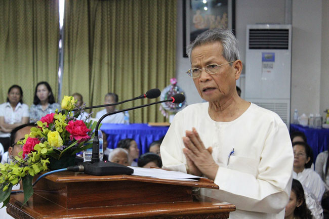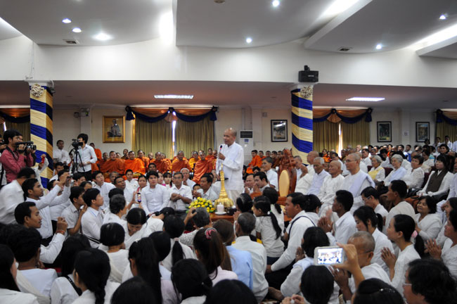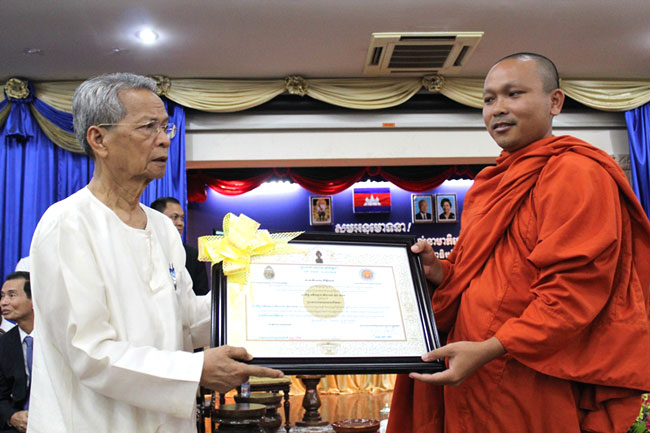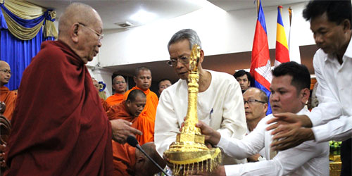 On Sunday afternoon, Paññāsāstra University of Cambodia (PUC) celebrated a ceremony to inaugurate the Tripitaka Commentaries in Pali, which are just newly developed and published by the PUC Buddhist Academy. “ The Khmer translated Tripikata Commentaries in Pali will exist in the world after publishing,” said Dr. KolPheng, PUC founding father. There are totally 50 series of tripitakacommentaries which were carefully verified. With the help from the corporate Buddha in Taiwan, over fifty thousand of the books were published. These will be distributed to local pagodas and international library. “ The books will be useful resources to the next generation for further study and research,” added Dr. Kol. Part of the ceremony, PUC will also confer Budhhist Honorary titles to over 100 Buddhist Masters who have devoted all their life teaching Buddhism and have contributed their Buddhist teaching knowledge to Cambodian society both in the country and abroad.