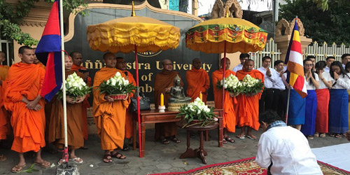 Meak Bochea is a Cambodian public holiday where all public and private institutions are off work. Similarly, the Paññāsāstra University of Cambodia (PUC) was not in operation; however yesterday (February 19, 2019), its students, teachers, staffs, and faculty members were on campus to organize the national celebration. Meak Bochea or Makha Bucha is known as the final sermon given by Buddha to cease from all evil, to do good, and to clean the mind.
