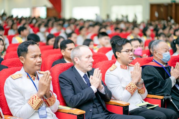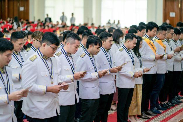 Continuing with our humble vision, playing an active role in the nation-building process for future generations, where non-violent means are used to resolve conflicts, beginning with individuals, societies, governments, and extending to the community of world leaders, I humbly believe that education is the key to fulfilling this vision. As people are well educated, exemplified, and attested by our proud graduates here gathered today, they are empowered to participate in and contribute more fully to the society. Education is, indeed, the foundation for genuine peace, security, and sustainable development for a prosperous nation and a peaceful world.